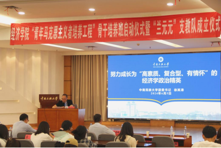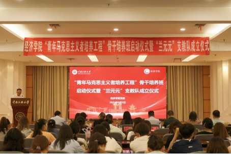 为深入学习贯彻习近平新时代中国特色社会主义思想和党的二十大精神,以马克思主义中国化的最新成果武装青年学生,6月5日晚,经济学院在润良报告厅举行“青年马克思主义者培养工程”骨干培养班(以下简称“青马班”)启动仪式暨“兰元元”支教队成立仪式。校党委常委、副校长李红燕,校团委书记徐其涛,经济学院党委书记戴迎峰,党委副书记、院长李波,党委副书记刘君强,正处级专职组织员黄仕清,副院长熊芳、马楠、毛中明,各年级辅导员出席仪式,第一期“青马班”全体学员、第一届“兰元元”支教队成员代表,学院团学干部代表参加仪式。仪式由经济学院院长李波主持。