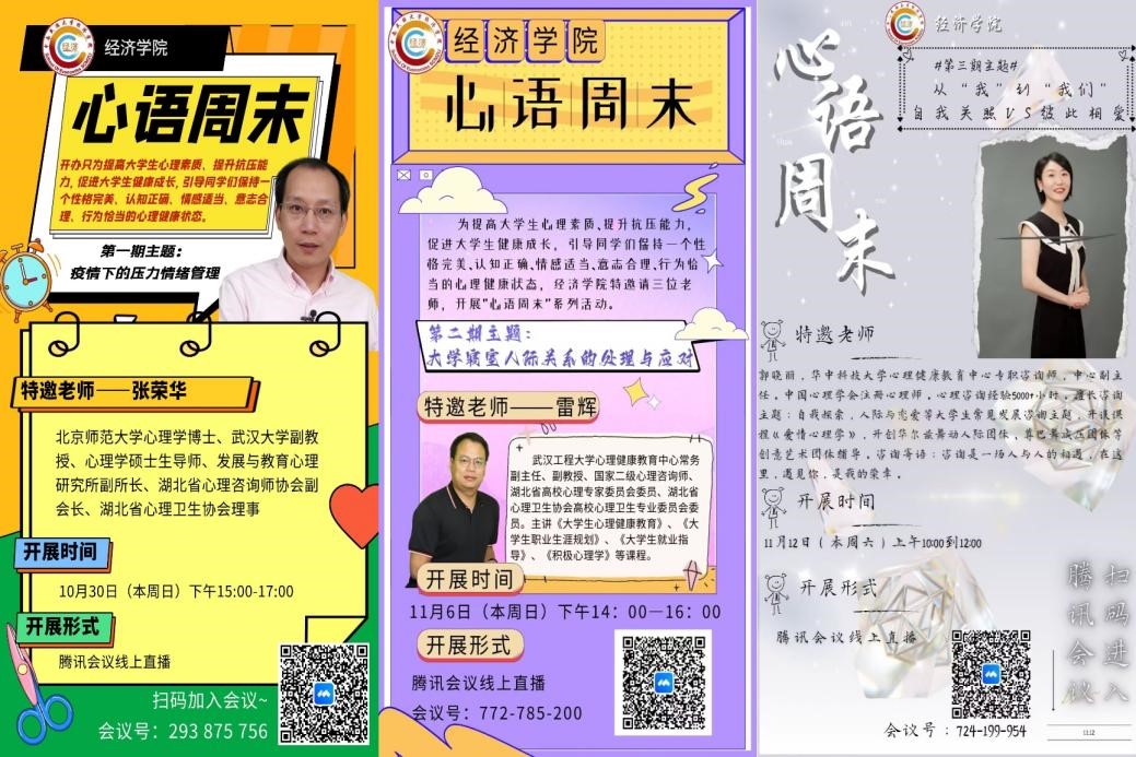 为引导学生正确认识自身心理健康状况,提升学生心理素质和抗压能力,10月30日至11月12日,经济学院于线上举办了“心语周末”系列活动,各级学生积极参与、认真聆听。