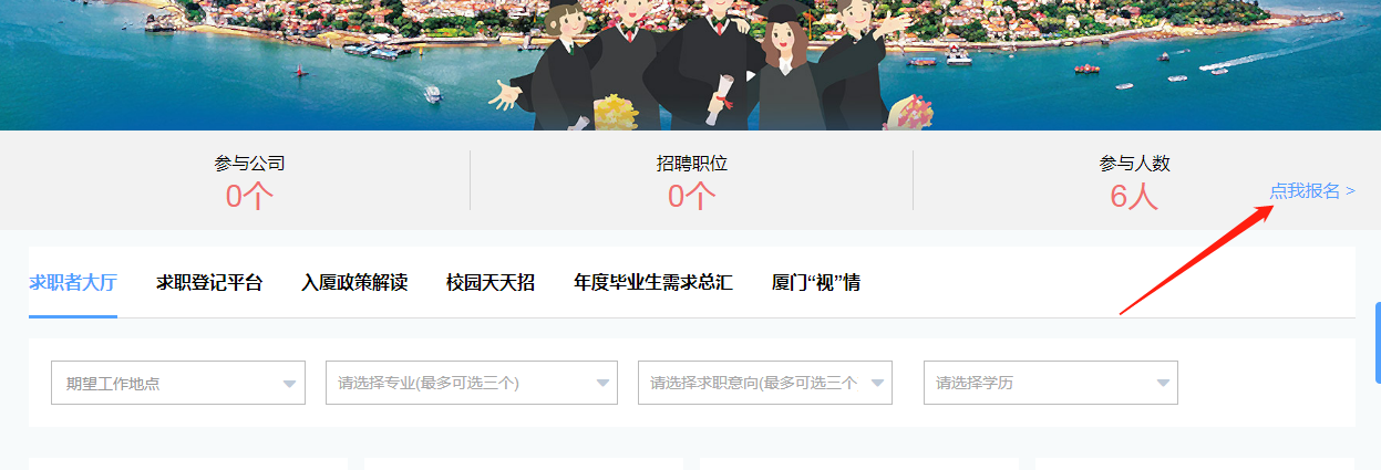 一、报名 ①访问网址https://xm.zhaopin.com 进入“智汇厦门·梦想起航厦门市企业面向院校毕业生线上大招聘”会场,选择【点我报名】。