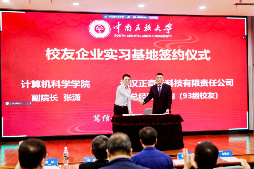 The signing ceremony of the alumni enterprise internship base kicked off amid warm applause. The School of Computer Science signed cooperation agreements with Wuhan Zhengqiyun Technology Co., Ltd., Wuhan Xijiawanwei Technology Co., Ltd., and Suzhou Meibijia Environmental Technology Co., Ltd. Both the school and the enterprises will jointly conduct research on prospective technologies and key common technologies, carry out the transformation of industry-university-research, and launch innovative integration and cross-border strategic cooperation.