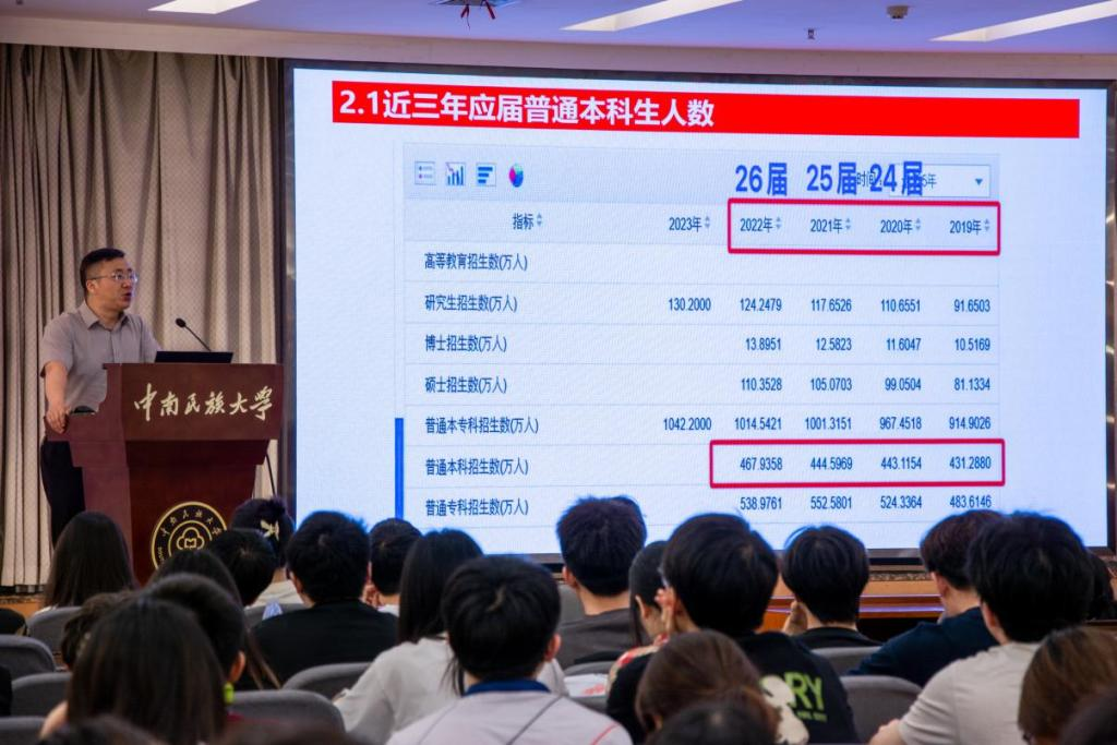 In order to fully implement the work plan of the CPC Central Committee and The State Council on promoting the employment and entrepreneurship of college graduates, To implement the work requirements of the Party Committee of Central South University for Nationalities on promoting employment, Deepening the party building brand of "casting soul education, digital wisdom power" of the Party Committee-the navigation project of the Party building leading the sail plan, Plan the college in 2025 postgraduate entrance examination in advance, On May 16th, 2024, at 6:30 PM, The School of Computer Science in the Runliang Lecture Hall launched the " Digital empowerment, Learning and application " as the theme of career development guidance report meeting, The conference invited Tan Xiaoyu, the principal of WANXUE EDUCATION - HAIWEN TEST PREPARATION Hubei Branch, to give a lecture, All undergraduate counselors of grade 2021 attended the meeting, more than 200 students of grade 2021 attended, The report was presided over by Yao Xinyu, grade 2021 undergraduate counselor.