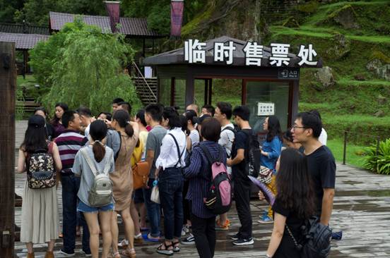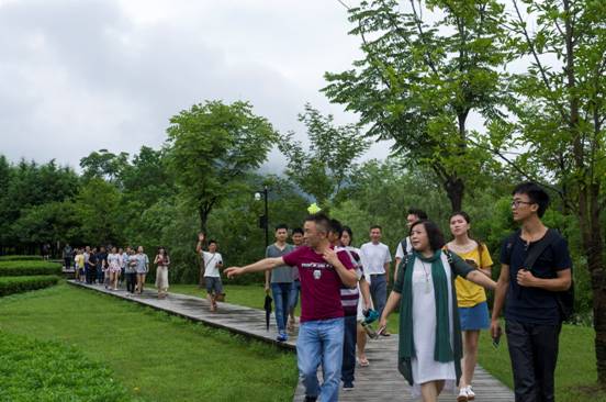 兴高采烈的学员们行走在土司城入口处的木栈道上。