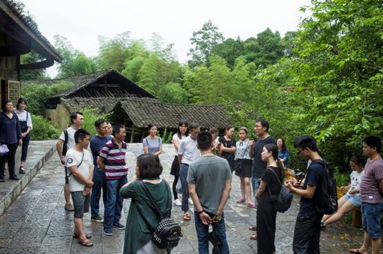 老师和学员们在土司城入口处听讲解员讲解土司城的历史和现状。
