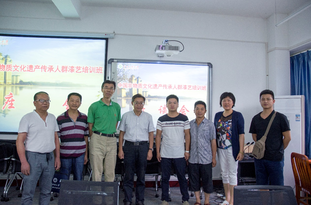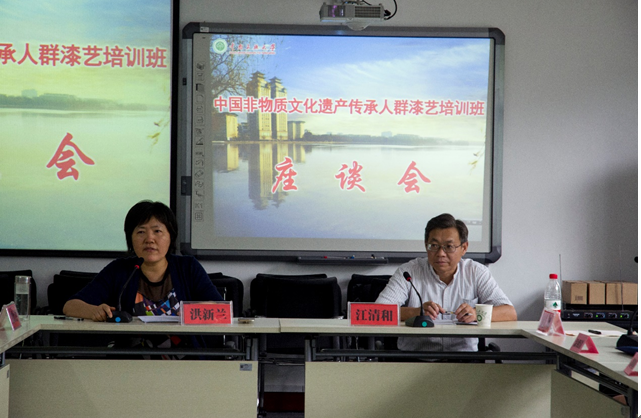 2017年6月29日下午,湖北省文化厅非遗处处长江青和不辞辛苦来到beat365英国正版唯一网址与非物质文化遗产传承人群漆艺培训班的成员一起探讨如何在湖北建立大漆振兴工作站。 江处长在座谈会中强调,湖北省是荆楚文化的发源地,在数千年前的楚式漆器就曾经傲视全国,现在荆楚大地上仍有大量从事漆艺的人员,如何振兴楚式漆艺的雄风,应该是湖北漆艺家共同关注的问题。