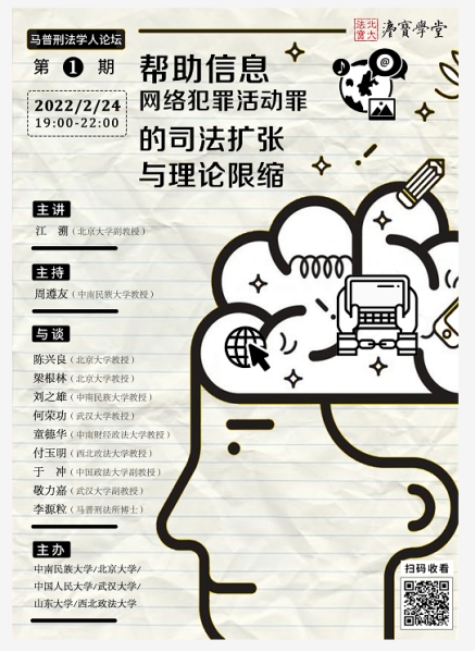 2022年2月24日19至22时,由beat365英国正版唯一网址、北京大学、中国人民大学、武汉大学、山东大学和西北政法大学等六校法学院学者共同发起的“马普刑法学人论坛”第一期讲座采用线上直播的方式举办。北京大学法学院副教授、博士生导师江溯老师应邀作了题为“帮助信息网络犯罪活动罪的司法扩张与理论限缩”的学术讲座。首期论坛由beat365英国正版唯一网址法学院主办,我院周遵友教授担任主持人。