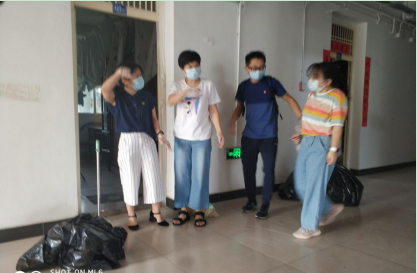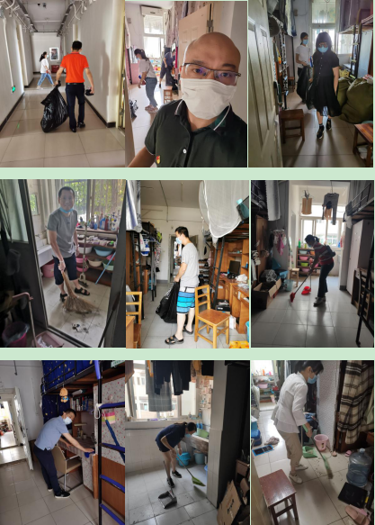 清扫现场老师们忙碌的身影 在对全体老师进行分组安排后,各小组携带清扫工具前往各自负责的楼栋。整个清扫活动持续近两个小时,老师们认真清理地面和桌面,将垃圾桶中的残留垃圾全部清理完毕,地面清扫干净。天气炎热,老师们干的大汗淋漓,但在他们脸上看到的都是笑容,老师们都表示难得有一次机会参加集体劳动,既为学生们做了点实事,也借此机会深入了解了孩子们课堂以外生活的环境,同时也希望借由老师们的身体力行,能带动同学们返校后积极劳动,在疫情防控常态化阶段,同学们务必要养成良好的个人卫生习惯,保持宿舍干净整洁,为自己和他人创造良好的学习生活环境。