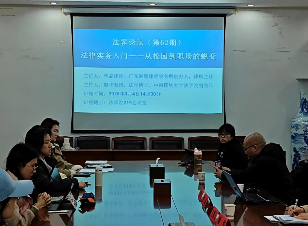 2025年3月4日下午,“法霁讲坛”第62期讲座于法学院219会议室开讲。广东湘翰律师事务所创办人、律所主任,我院02级校友曾晶律师受邀做以“法律实务入门——从校园到职场的蜕变”为主题的讲座。讲座由廖华副院长主持,郑武平老师、黎宇霞老师出席了本次讲座,我院2021级本科生及研究生参加了本次讲座。