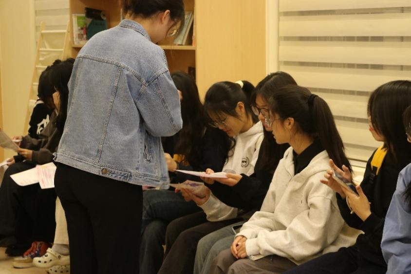 同学们于空中书屋中就座,交流分享对于本次参观活动的感受与收获并提出了一些改善建议。一些同学认为可以在空中书屋播放轻缓的音乐并设置清新香氛,以增加书屋的艺术气息;还有同学希望可以增设线上咨询服务,让心理咨询更加生活化和便利化。交谈过后,值班助管同学为大家分发纪念书签和心理咨询宣传单页,使大家能够更充分地了解并宣传心理咨询中心。