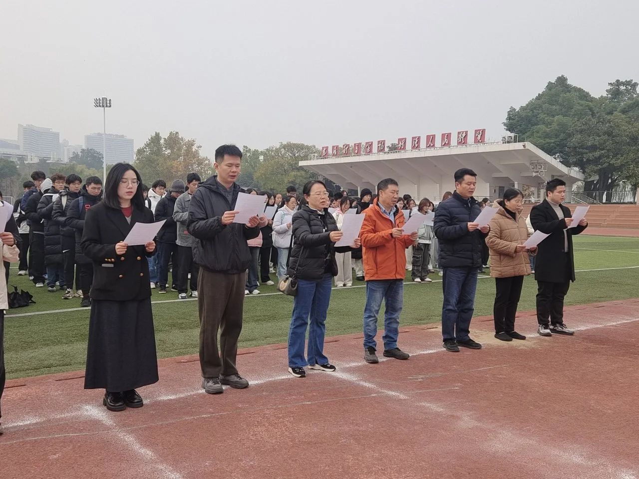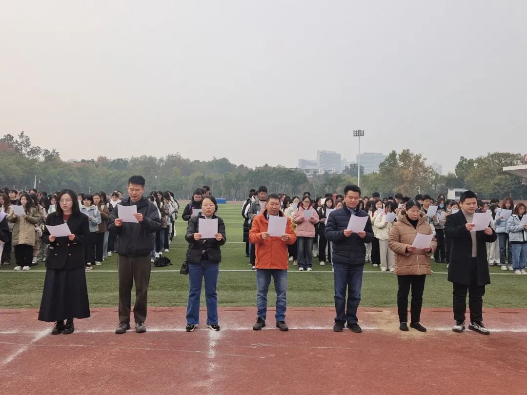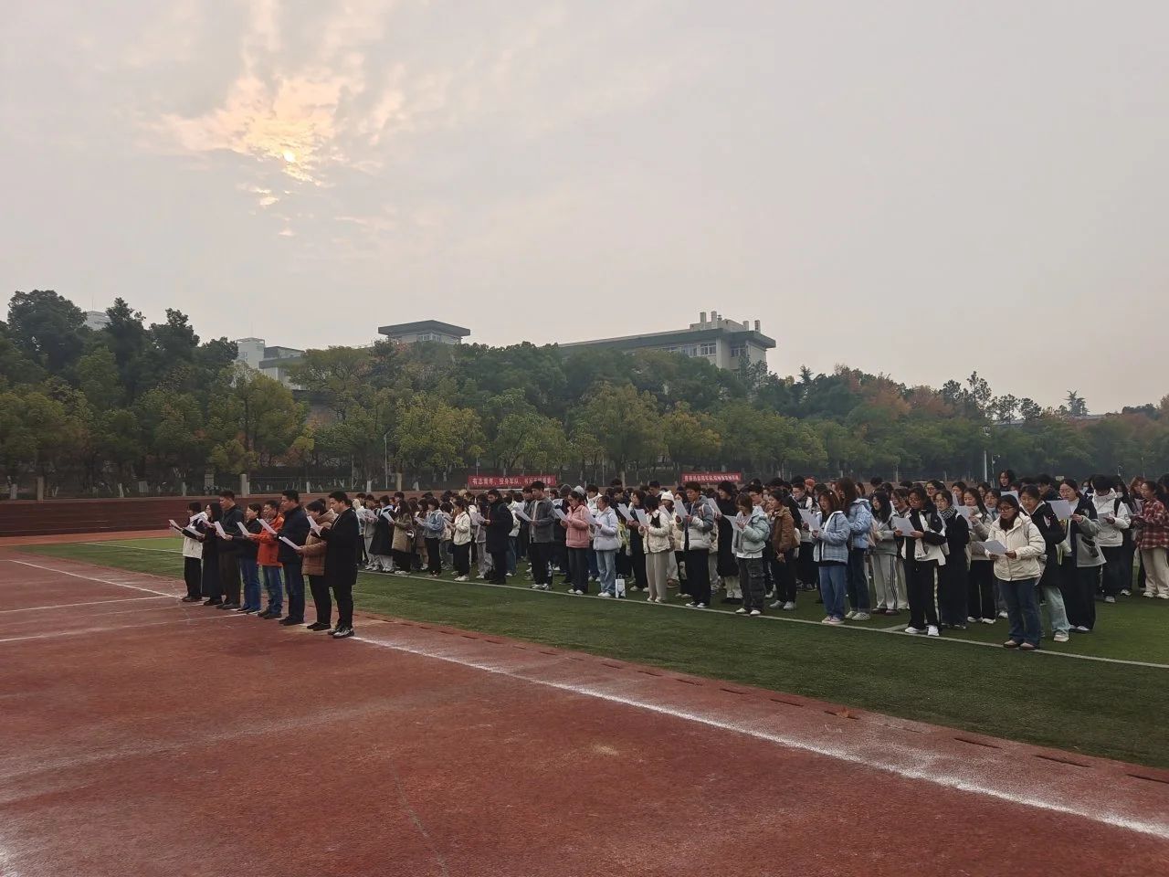 2024年12月4日,我院党委书记邓行、党委副书记、纪委书记姜珍、副院长杨帆、副院长廖华、学工办副主任张利菊、团委副书记李青、2023级辅导员陶恒以及2024级全体大一同学在南湖操场国旗台下参与了宪法晨读活动。当清晨的第一缕阳光洒满校园,师生们手捧宪法读本,声音洪亮地诵读着宪法条文,每一个字都充满了对法律的敬畏和对法治的热爱。