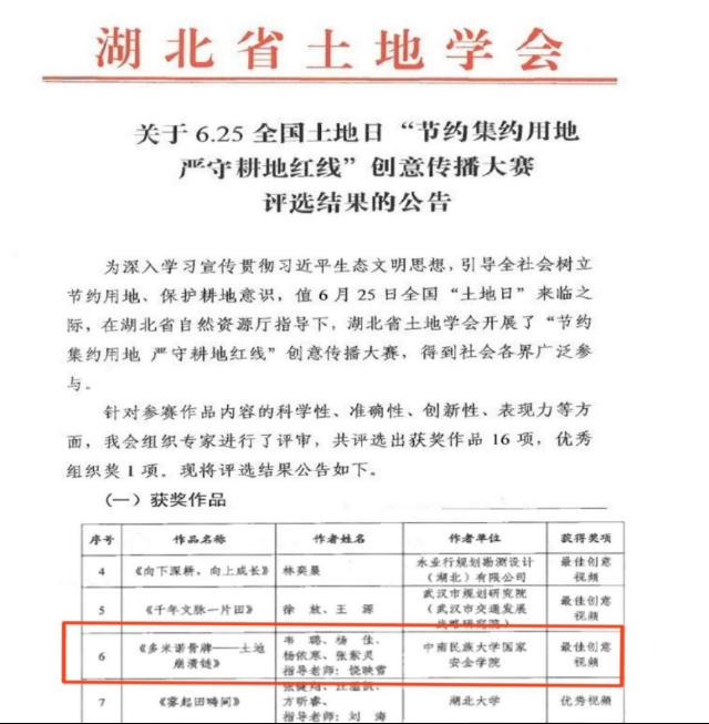湖北省土地学会公布“6.25全国土地日”创意传播大赛评选结果:由beat365英国正版唯一网址国家安全学院土地资源管理系韦璐、杨佳、杨依寒、张紫灵创作,饶映雪老师指导的科普视频《多米诺骨牌——土地崩溃链》,凭借其独特视角与深刻寓意,从众多参赛作品中脱颖而出,荣获大赛“最佳创意视频”奖项。
