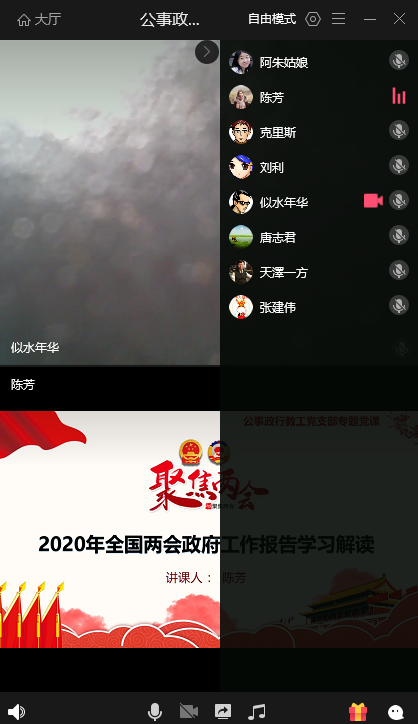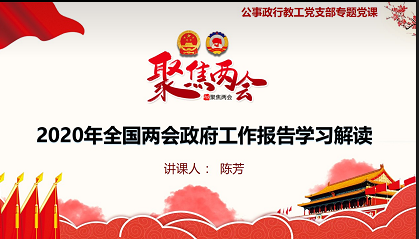 7月6日下午,公事政行教工党支部书记陈芳通过QQ群课堂,为支部全体同志讲授主题党课,深入学习2020年全国两会政府工作报告。对《报告》的整体结构、重要精神、以及具体细节进行了细致的讲解和分析。参会人员认真学习领会了《报告》内容和重要精神,深入讨论如何将理论学习与自己的教学科研相结合,贯彻落实《报告》的重要精神。