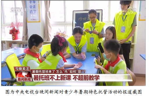在友谊青空社工服务中心本部,同学们在社工人员的指导下,组织策划了江汉区青少年暑期活动开营仪式暨“庆祝建党百年,传承红色基因,争做时代新人”主题队日活动。同学们充分发挥自己的专业优势和特长,在青少年暑期托管活动中当起了“小老师”,为小朋友们提供了手工制作、创意魔术、电影欣赏、法律科普等丰富多彩的活动课程。2021年7月8日,中央电视台晚间新闻对同学们参加的青少年暑期特色托管活动进行了采访报道,对托管活动的效果给予肯定。
