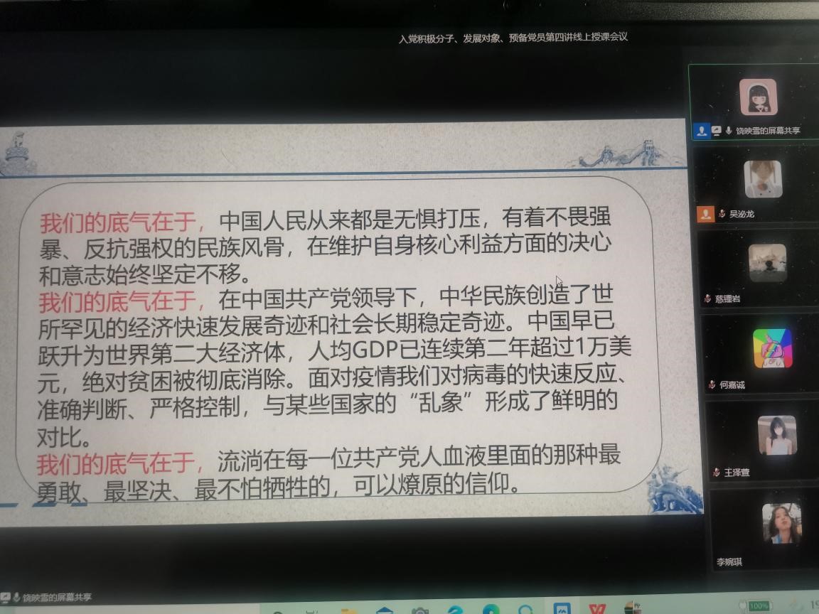 2022年5月7日,公共管理学院党校培训班第四讲在企业微信平台举行。参加本次会议的有公共管理学院饶映雪老师,入党积极分子培训班、发展对象培训班与预备党员培训班全体同学。本次开班仪式由发展对象培训班负责人吴泌龙主持,饶映雪老师主讲。