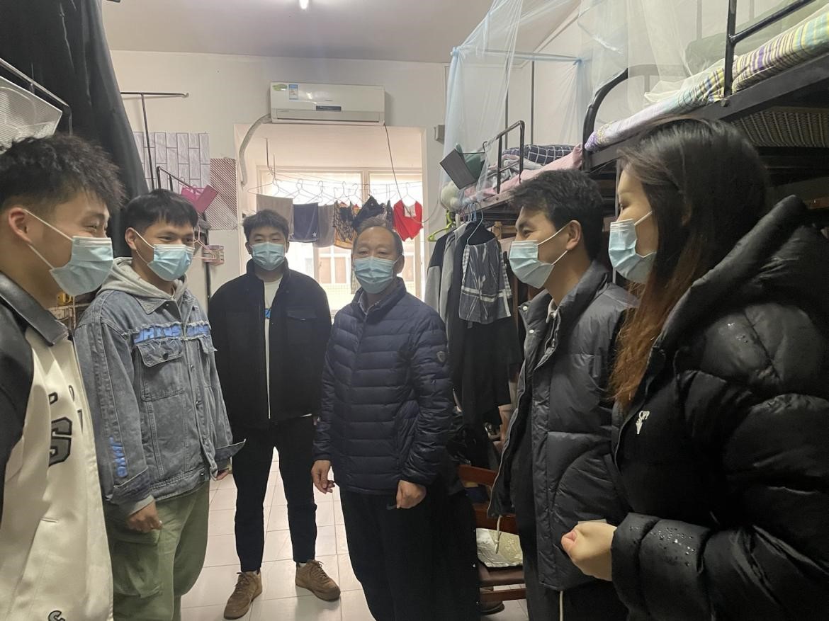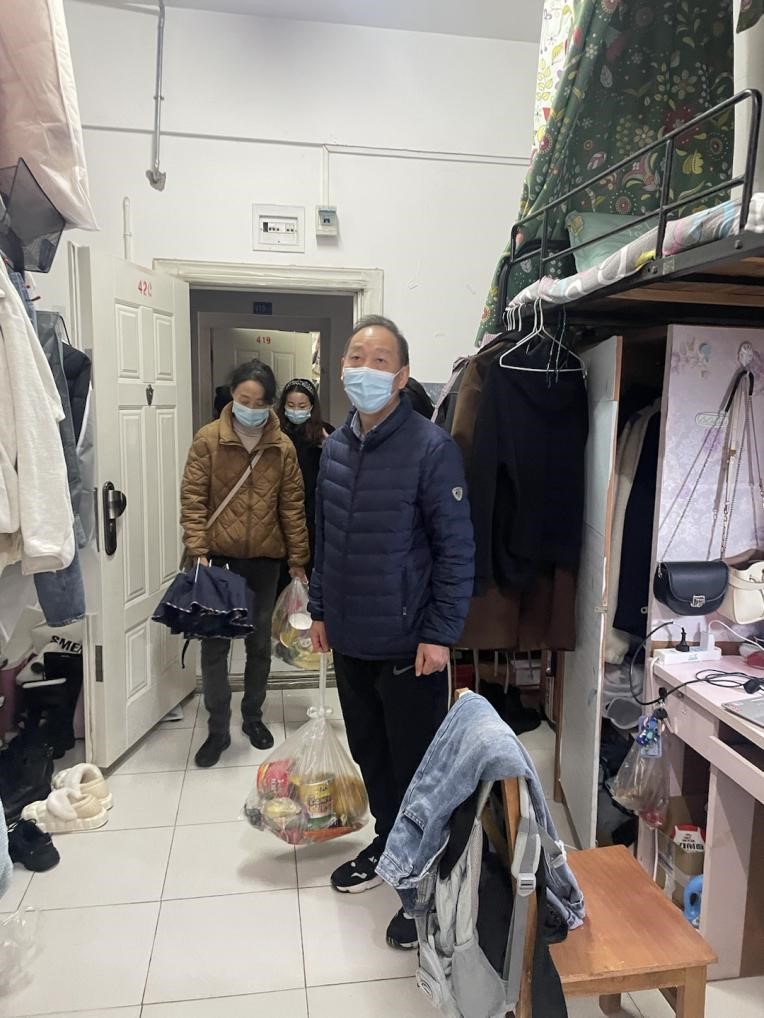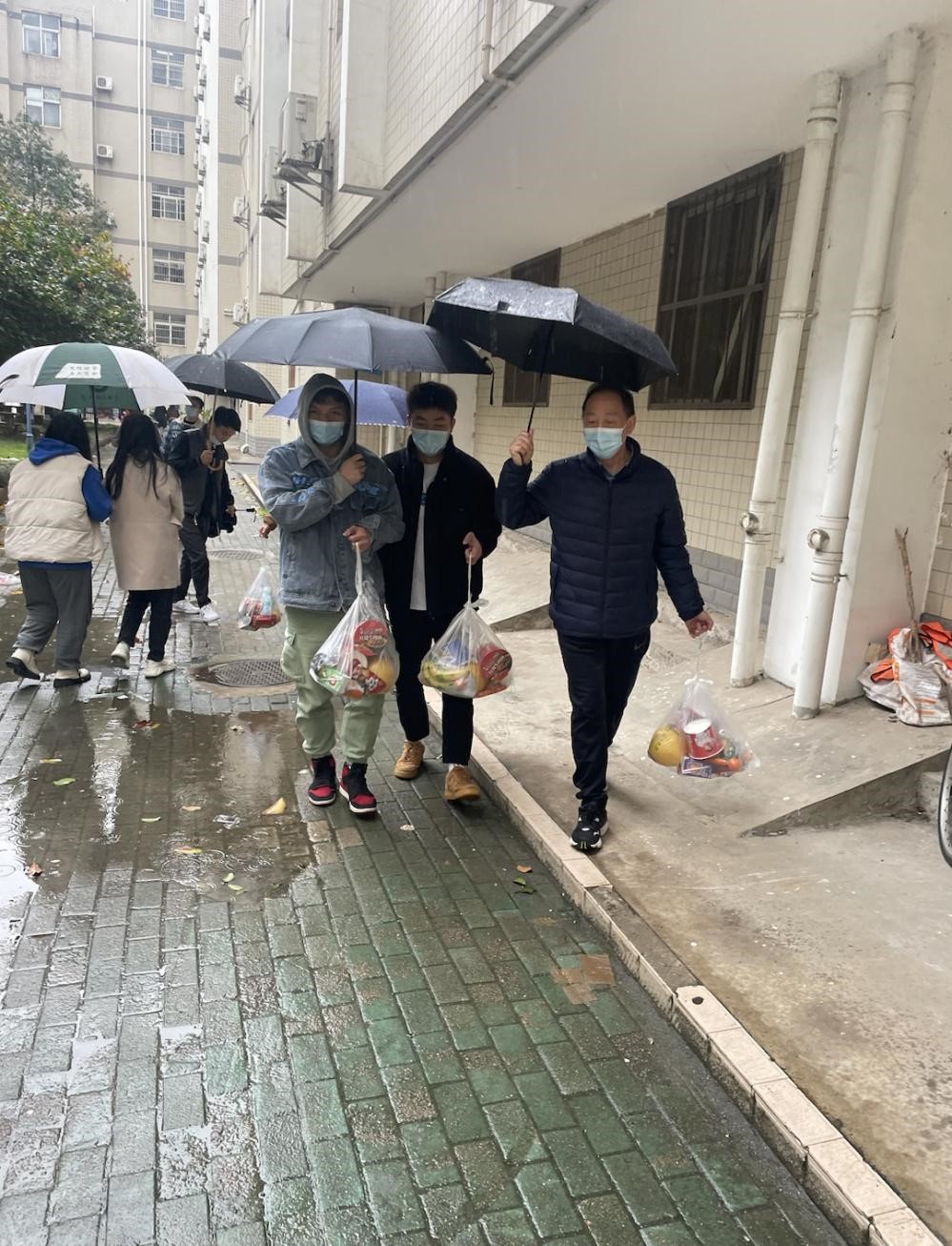 由于武汉市新冠肺炎疫情波动,学校实行静默管理。2022年11月29日星期二即静默管理第四天,公共管理学院吴开松院长,杨燕老师、雷盼老师等前来探望封控的研究生同学。
