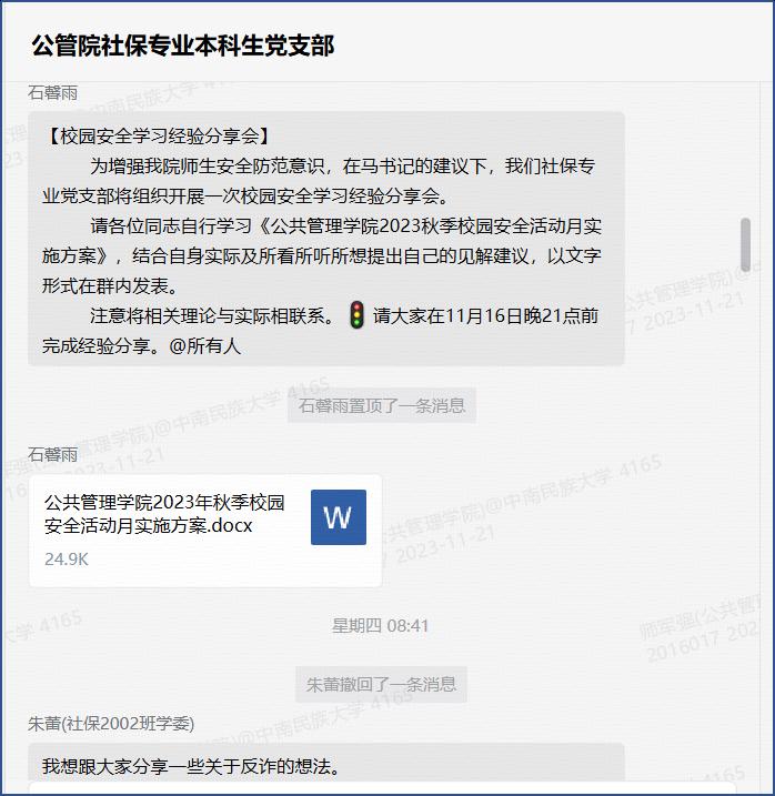 为增强党支部同志们的安全防范意识,学校的相关工作安排,按照《公共管理学院2023年秋季校园安全活动月实施方案》,我院劳动与社会保障本科生党支部于11月14日-11月16日积极组织开展了校园安全学习经验分享会,支部全体党员参加会议。