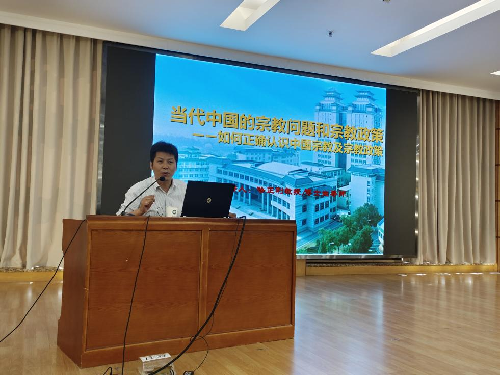 哈正利教授首先从背景引入,指出中国是多宗教的国家,介绍了我国五大宗教在中国的基本情况。随后,哈正利教授对党的宗教工作基本方针进行了系统梳理介绍,表明宗教工作在党和国家工作全局中具有特殊重要性,宗教工作的本质是群众工作。接着,哈正利教授阐述了马克思主义的宗教观,表示要用马克思主义方法正确认识宗教问题,宗教工作要服从无产阶级革命总任务,并强调要辩证看待宗教的社会作用,认识其“两重性”。通过学习习近平总书记关于宗教工作的论述,深刻认识引导宗教界为促进社会和谐稳定的重要性。最后,哈正利教授在指出当前宗教领域突出问题的基础上,通过对《宗教事务条例》的解读,论述了如何促进宗教事务管理的法治化。