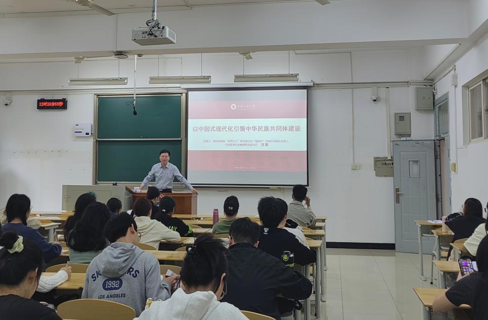 方堃老师主讲的题目是《以中国式现代化引领中华民族共同体建设》,他从“逻辑”、“动力”、“路向”三个维度进行了讲授。首先,在逻辑方面,方老师认为“各民族共同发展繁荣”与“实现社会主义现代化”在同源、同程和同向上是全方位耦合的。中国式现代化是56个民族的现代化,没有各民族共同团结奋斗就难以实现社会主义现代化,没有各民族共同繁荣发展也不是社会主义现代化。接着,他围绕认同整合、利益协调、政策引导等方面,阐述了中国式现代化引领中华民族共同体建设的动力机制。然后,方堃老师提出,应从五个方向以中国式现代化引领中华民族共同体建设:一是以铸牢为主线,夯实各民族共同发展的思想根基;二是以共富为引擎,谱写高质量发展新篇章;三是构建共建共治共享格局,推动各族群众互嵌式发展;四是建设共有精神家园,铸魂中华民族现代文明;五是探索生态和谐共美,营造宜居宜业美丽家园。
