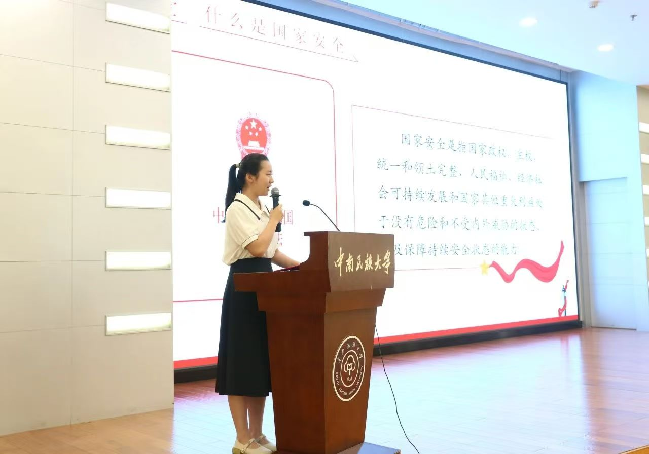 洪山中学九(7)班牛若惜同学以《以融合之基,筑国安之厦》为题发表演讲,她目光坚定,声音铿锵:“国家安全涵盖政治、经济、文化等诸多维度,民族融合与之血脉相连。作为新时代青年,我们誓做国家安全与民族团结的坚定守护者,为国之安泰、民族之和美贡献青春力量!”这份掷地有声的宣言,点燃了全场学子心中的责任之火。
