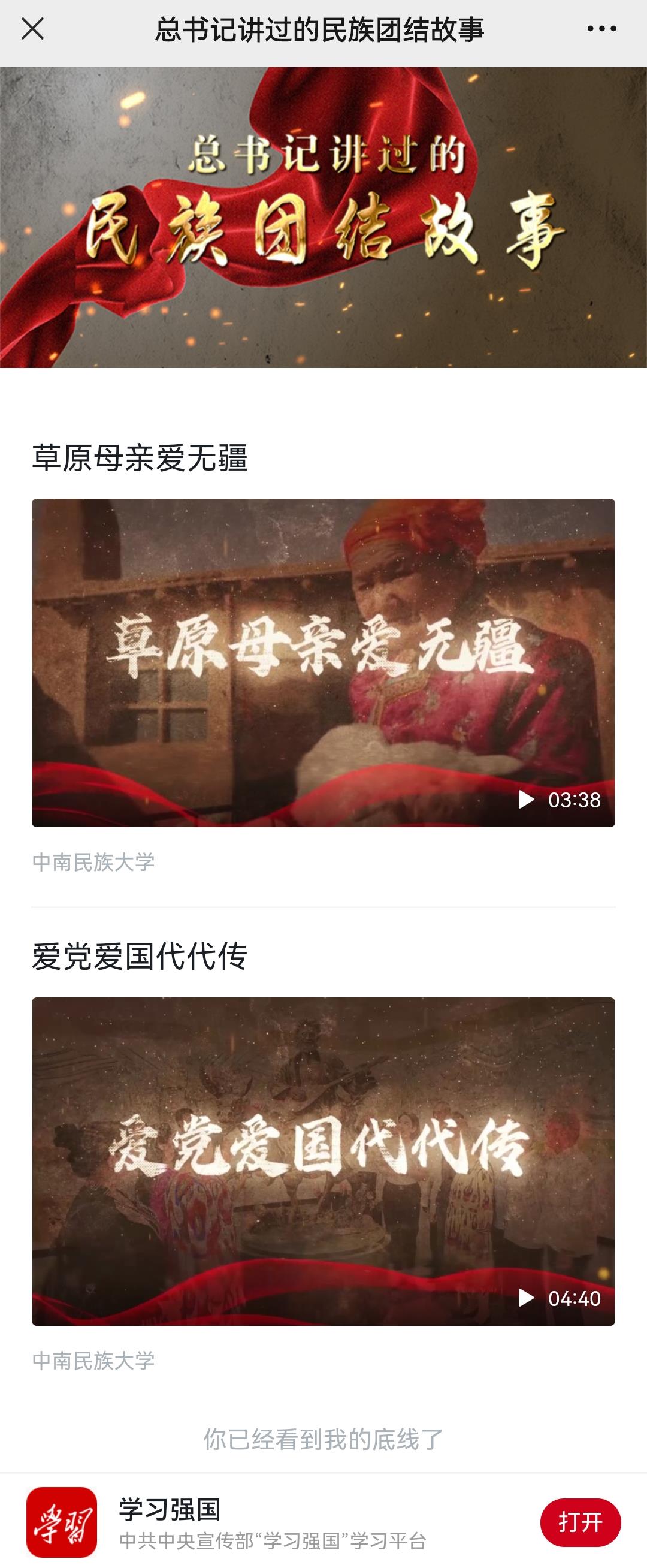 学习强国平台已开辟专题、上线两部视频,其余视频将于近期陆续上线。新华社客户端、人民网、道中华微信公众号等媒体平台也将推送该系列视频。以此为契机,我院将在学校党委正确领导下,始终坚持以铸牢中华民族共同体意识为主线,进一步创新工作思路、加强统筹谋划,制作推出更多主题宣传作品,着力加强铸牢中华民族共同体意识宣传教育,引导各族师生铸牢中华民族共同体意识。