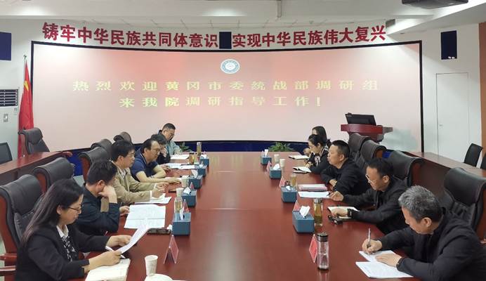 院长姚上海向调研组一行介绍了我院以努力建设好、管理好中央四部委“铸牢中华民族共同体意识研究基地”为契机,深入推进《中华民族共同体概论》课程建设、中华民族共同体学学科建设等工作情况,并表示要进一步深化与黄冈市委统战部合作,持续加强铸牢中华民族共同体意识教育实践基地建设,积极为黄冈市开展铸牢中华民族共同体意识工作献计献策、出力出智。
