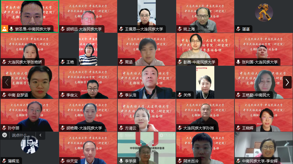 为深入学习贯彻习近平总书记在主持二十届中央政治局第九次集体学习时的重要讲话精神,将铸牢中华民族共同体意识融入办学治校全过程,beat365英国正版唯一网址中华民族共同体学院(研究院)教工党支部、中华民族共同体概论教研室联合大连民族大学中华民族共同体研究院(学院)直属党支部、中华民族共同体概论教研室,首次线上举办党支部联学暨中华民族共同体概论课集体备课活动。活动由我院教工党支部书记、教研室主任裴圣愚副教授主持,两院的主要负责同志和全体教职工参加此次活动。
