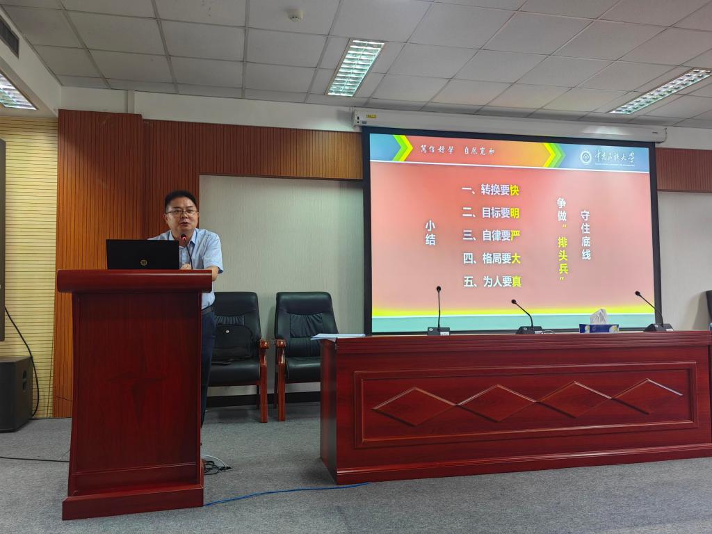 贺展向学生传达学习了习近平总书记在全国民族团结进步表彰大会上的重要讲话精神以及全国民族民族团结进步表彰大会的重大意义及相关情况。随后贺展讲授开学第一课并提出五点要求:一是转换要快;二是目标要明;三是自律要严;四要格局要大;五是为人要真。