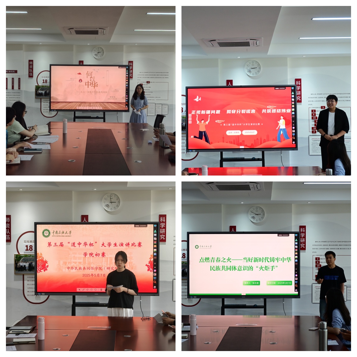比赛中,我院4位选手按抽签顺序逐一上台演讲,他们分别以《何以中华》《正视新疆问题,揭穿分裂谎言,共筑团结伟业》《点燃青春之火——当好新时代铸牢中华民族共同体意识的火炬手》《一束微光,万千星河》为题,围绕《中华民族共同体概论》教材及大讲堂核心内容,从多元视角进行深度阐述。