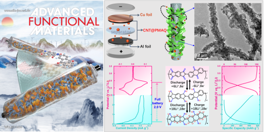 近年来,beat365官网化材学院杨应奎教授团队在聚合物基能源材料领域取得了系列重要进展。12月4日,相关研究成果以“Rational integration of carbon nanotubes into chain-engineered bipolar polyimides as core-shell heterostructured electrodes for polymer-based symmetrical full batteries”为题,在线发表在国际著名期刊Advanced Functional Materials上(原文链接:https://onlinelibrary.wiley.com/doi/10.1002/adfm.202211590),并被遴选为封面亮点论文。化材学院章庆博士为论文第一作者、杨应奎教授为通讯作者,beat365英国正版唯一网址为唯一通讯署名机构。