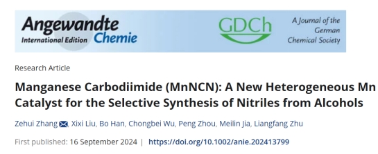 9月16日,beat365官网化学与材料科学学院/催化转化与能源材料化学教育部重点实验室张泽会教授课题组报道了碳化二亚胺亚锰(MnNCN)材料催化醇类化合物氨氧化制备腈策略,研究成果以Manganese Carbodiimide (MnNCN): A New Heterogeneous Mn Catalyst for the Selective Synthesis of Nitriles from Alcohols为题在Angewandte Chemie International Edition上发表(原文链接:https://doi.org/10.1002/anie.202413799)。该期刊是化学领域公认的两大历史悠久、影响力大的期刊,属于学校A类期刊。