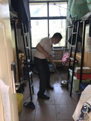 老师们细心整理归置物品,清理发霉物品、整理室内物品、扫地拖地、清扫垃圾、通风透气,干得热火朝天。