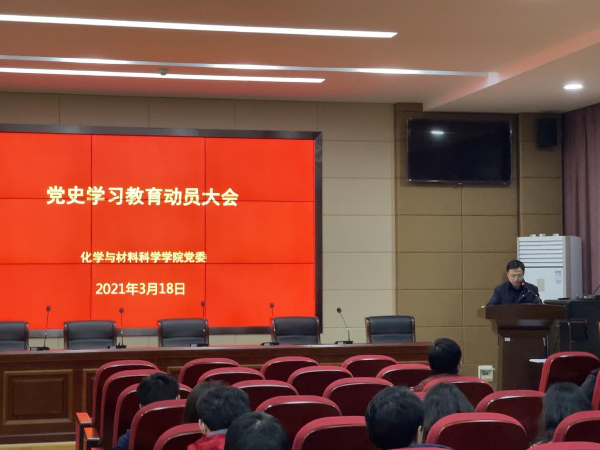 2021年3月18日下午,为深入学习贯彻习近平总书记在党史学习教育大会上的重要讲话精神,全面贯彻落实上级和学校党委有关部署要求,学院党委在化材院一楼大会议室召开党史学习教育动员大会。学院党政领导班子成员及各党支部书记、学生党员代表参会,党委副书记郭晖同志主持会议。