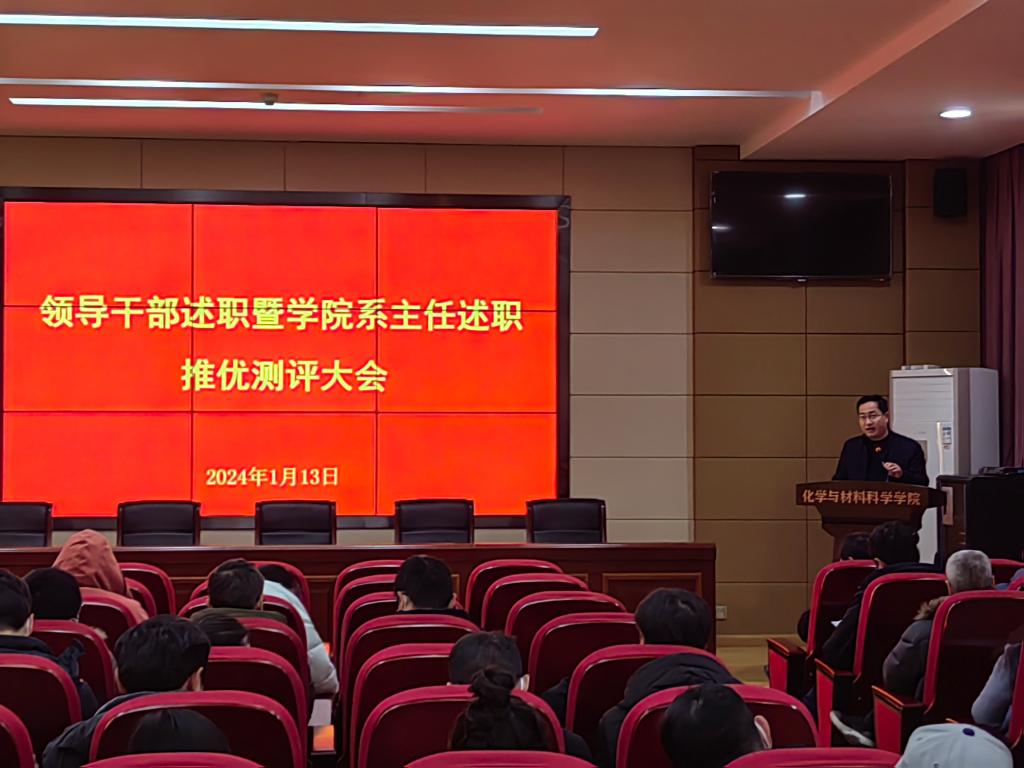 1月13日上午,化材学院举行学院领导班子和内设机构负责人年终述职测评会。会议全面总结2023年度学院工作,盘点成绩,总结经验,查找不足,规划未来。学院党政班子成员和全体教职工参加会议,会议由院党委书记祁帆主持。