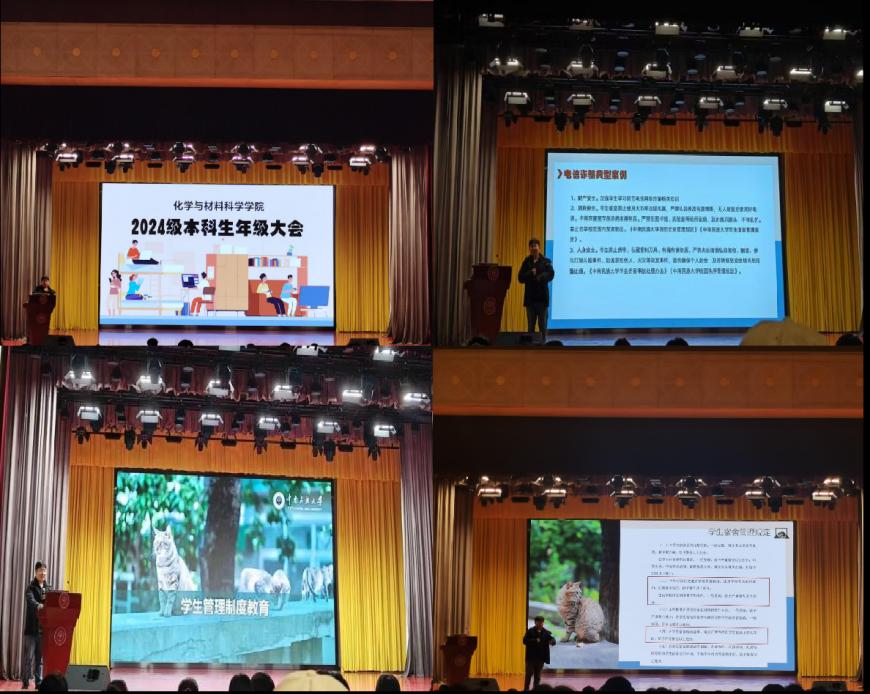 12月5日下午,化学与材料科学学院(简称“化材学院”)在学术会堂举行了2024级本科生年级大会。此次大会由辅导员张朝冲老师主持,2024级全体本科生参与。张朝冲老师为2024级本科生详细介绍了学校与学院的教育教学管理体系,旨在帮助同学们更好地适应并融入大学生活。在谈及“校园生命财产安全”时,张朝冲老师以生动案例和详实数据,分析了校园内可能存在的安全隐患,如火灾、网络诈骗等。他提醒同学们一定要时刻保持警惕,增强自我保护意识。在“宿舍管理”方面,他希望同学们养成良好的个人习惯,严格遵守宿舍管理制度,共同维护宿舍的整洁,营造一个温馨、舒适的学习生活环境。