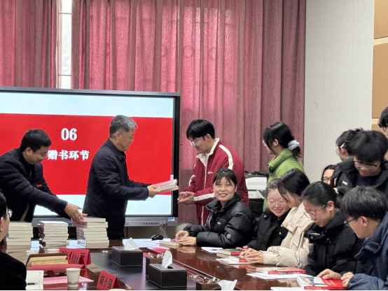 韩叶盛向同学们赠送了《习近平的七年知青岁月》、《习近平与大学生朋友们》第一、二卷。