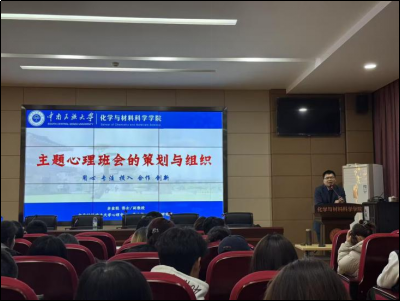 为深化心理健康教育工作内涵,强化班级心理骨干队伍建设,3月28日晚,化学与材料科学学院于化材楼学术报告厅组织开展"主题心理班会的策划与组织"专题培训。本次培训特邀中南财经政法大学心理健康教育中心余金聪副教授担任主讲,学院心理工作站副站长张雪花老师主持,各年级班长、团支书及心理委员参训。