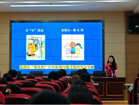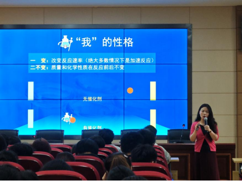 随后,李琳教授从科普角度出发,以第一人称的新颖形式讲解催化剂的基本原理。通过讲述实验现象和具体实例,她生动地展示了催化剂在化学反应中的关键作用,现场听众积极参与其中。