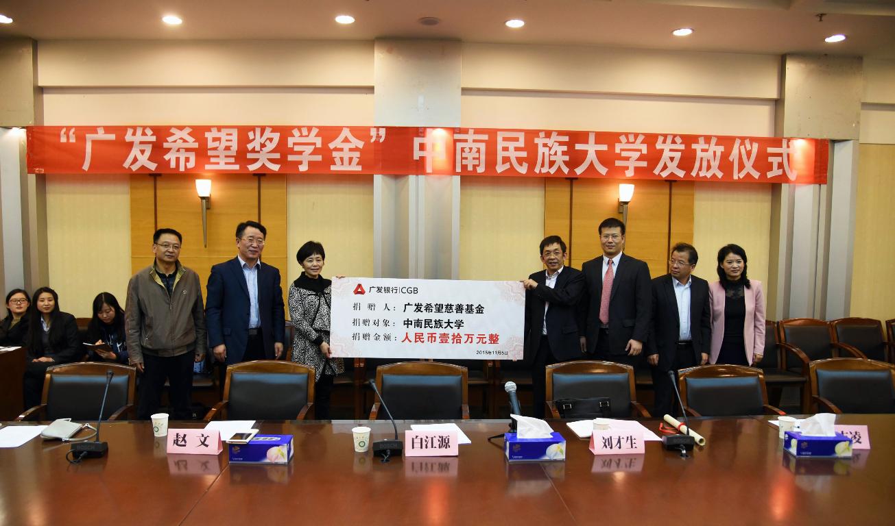 2015年11月5日,“广发银行希望奖学金”发放仪式在beat365官网学术交流中心举行。广发银行党群工作部副部长刘才生、武汉分行纪委书记庞志凌,beat365官网领导白江源、赵文及学工部、团委、校教育发展基金会秘书处、校友会办公室、财务处等相关部门负责人出席仪式。仪式由校团委书记江莹主持。