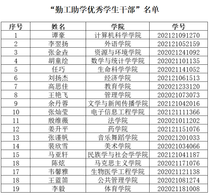 根据《beat365英国正版唯一网址勤工助学管理办法(民大发〔2019〕44号》有关规定,勤工助学指导中心近期开展了勤工助学评优评先工作。经用工单位推荐,勤工助学指导中心组织推选,拟评选“勤工助学先进集体”7个,“十佳自立自强代表人物”10名,“勤工助学先进个人”71名,“勤工助学优秀学生干部”19名。现将结果公示如下,如有异议,请于三天之内向勤工助学指导中心反映,联系方式:中南民大勤工助学(QQ:2377175805)
