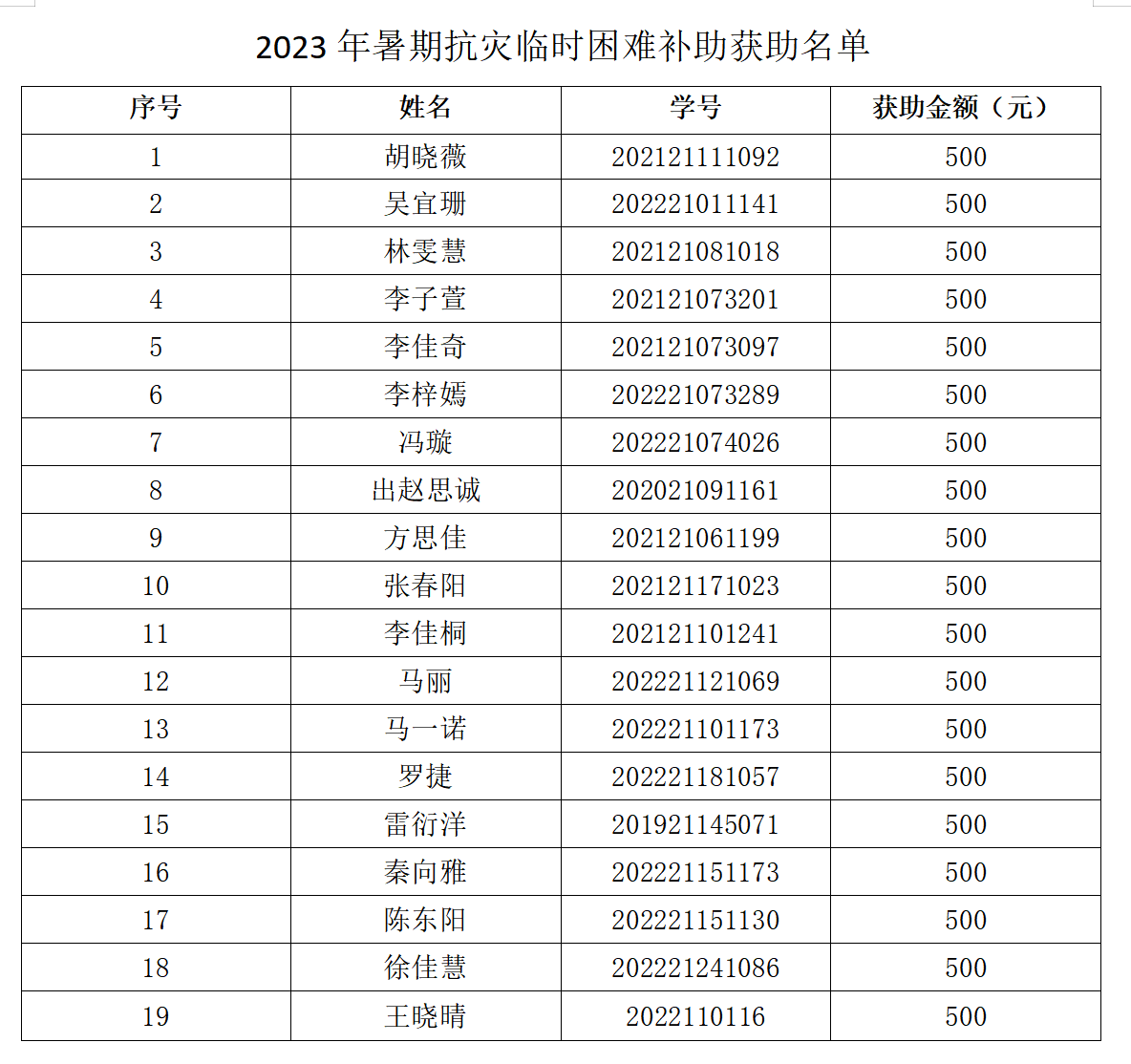 为精准做好受灾地区学生帮扶救助工作,帮助受灾地区学生平稳度过灾情,beat365官网于暑期开通了抗灾临时困难补助通道。经学院老师摸排和学生申请、学院审定、党委学工部核准,最终确定为胡晓薇等19名同学发放抗灾临时困难补助。具体发放名单如下:
