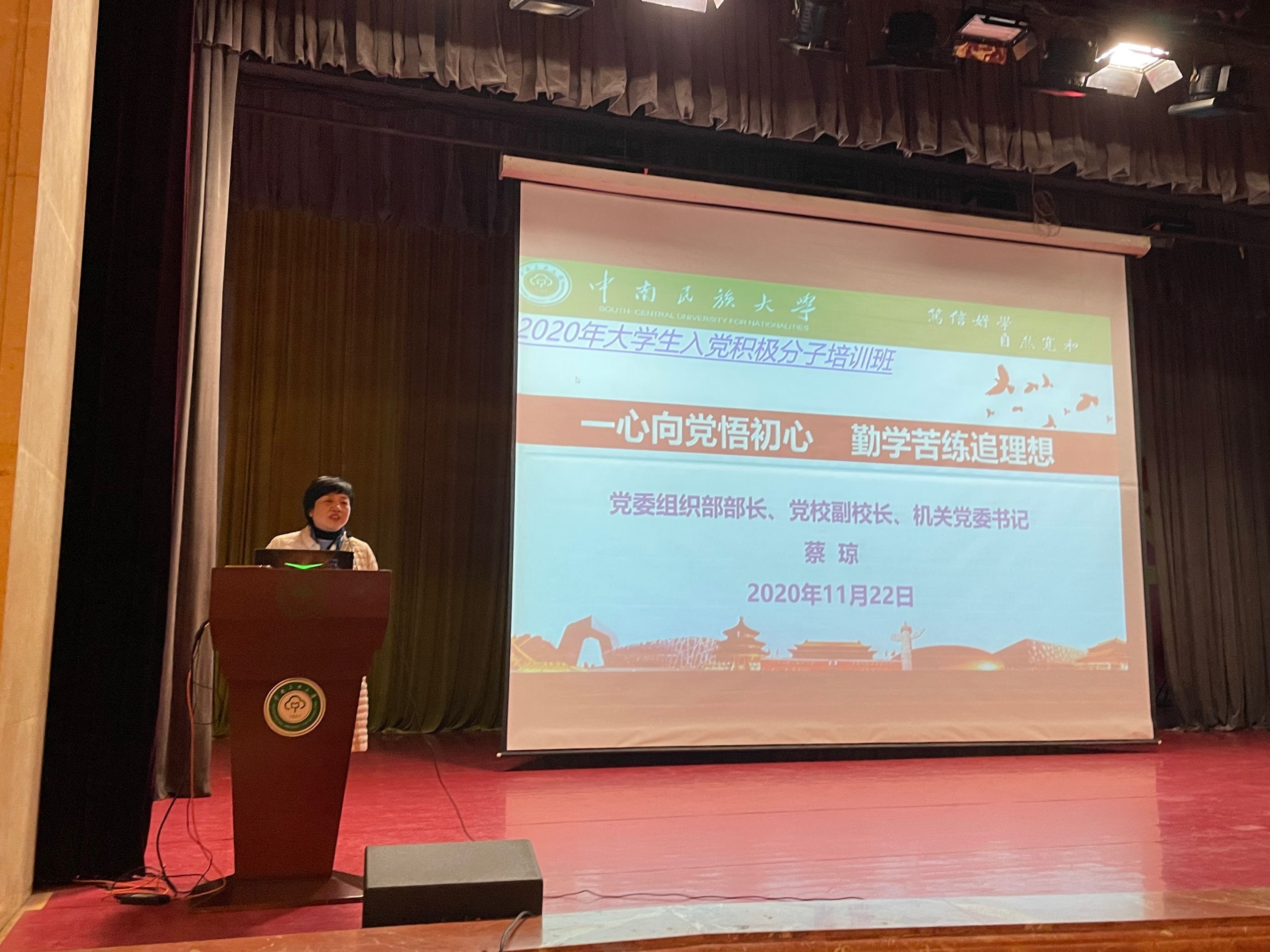 随后,蔡琼部长开始专题党课授课。她带领大家探寻了新中国成立70年来辉煌成就的“中国密码”、全面建成小康社会征程上脱贫攻坚的“中国力量”以及全民参与的抗疫斗争实践的“中国担当”,从实践层面回顾了中国共产党领导下的新中国发展历程以及取得的卓越成就,并结合入党积极分子和发展对象思想实际,重点讲述了新时代少数民族青年学生的努力方向,寄语全体学员要学会学习、学会思考、学会实践、学会将人生过得富有意义和乐趣。