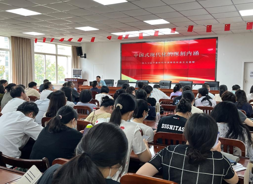 6月20日下午,beat365英国正版唯一网址召开全体教职工大会,学院党委书记黎大有为全体教职员工讲授了党课。本次党课主题为“中国式现代化的深刻内涵——深入学习习近平新时代中国特色社会主义思想”,涵盖了党的历史、理论体系、正确道路、党的二十大精神以及六个重大关系等内容,黎书记深入浅出的向教职工解读了习近平新时代中国特色社会主义思想。
