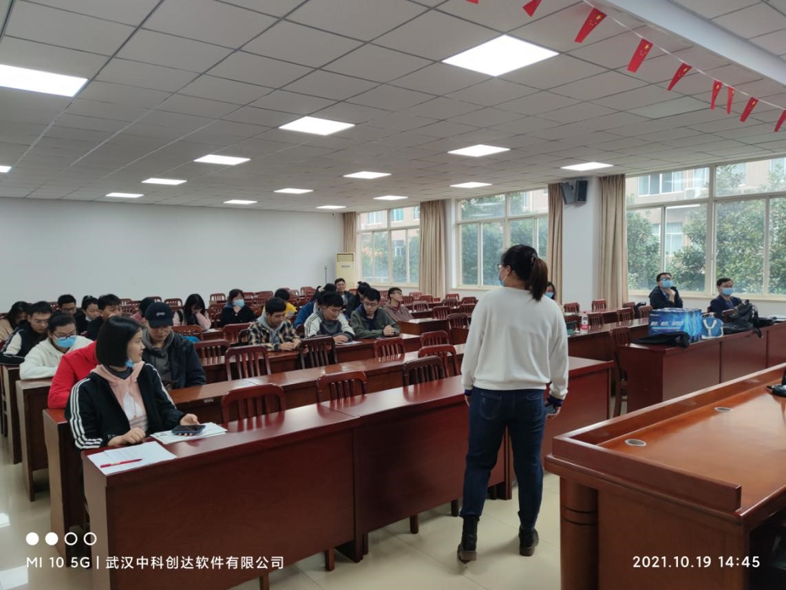 招聘会上,武汉中科创达软件有限公司的负责人李航通过PPT展示,围绕公司概况、招聘岗位及未来晋升空间、福利待遇和招聘流程等方面做了详细介绍,帮助同学们了解本公司及岗位需求。