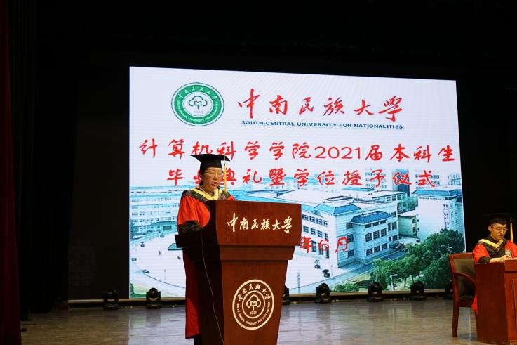 典礼伊始,全体起立,老师们和21届毕业生共同奏唱国歌。随后,覃俊致辞,她与我们分享了她了解到的一些毕业学子难忘的场景——有奋斗的考试周、有迈入新阶段的喜悦、有半夜生病舍友的陪伴。回望了四年大学生涯后,覃俊也对毕业生们寄予了“修身,齐家,治国,平天下”的殷殷嘱托。
