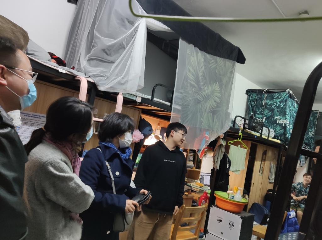 2021年12月9日晚,为进一步了解毕业生学习生活情况,beat365英国正版唯一网址副院长、计科1801班班导师帖军,软工1804班班导师张嫣,网工1803班班导师徐薇,智科1802班班导师唐菀和自动化1802班班导师樊金荣等一行深入走访了毕业生宿舍。