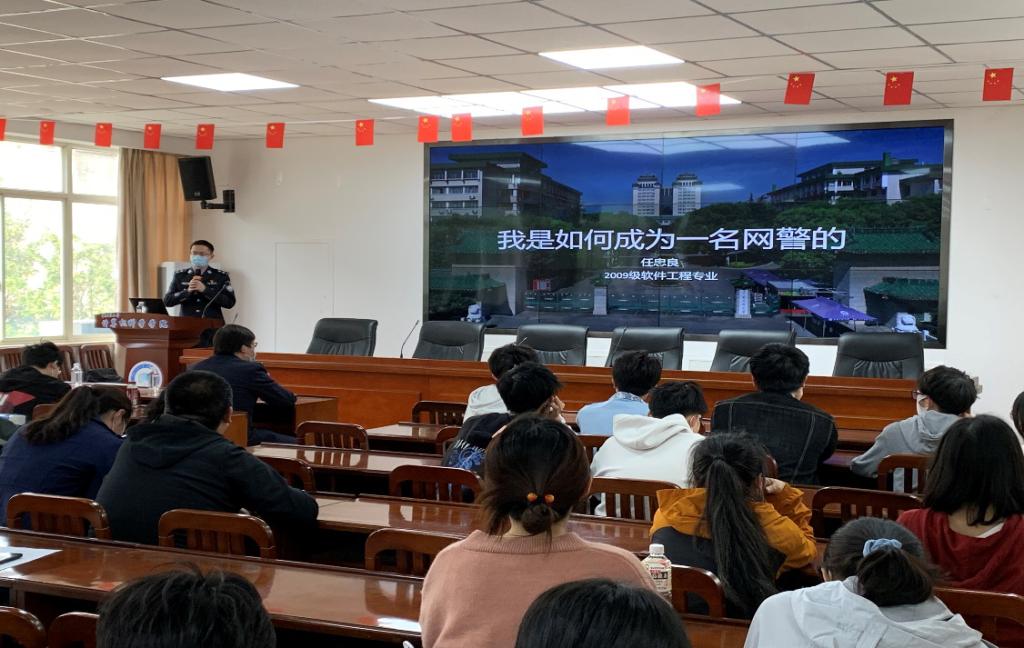 随后,黄俊道警官结合实际工作中的相关案例,谈及发生在校园内外广大师生身边的并不遥远的网络安全风险,例如:不法分子利用QQ、微信等渠道借贷、网络代考、电信诈骗等等,并具体指导我们在校大学生们如何提高自我防范意识,避免陷入不法分子陷阱;任忠良警官(任警官是我院原2009级软件工程专业的毕业生)结合自己的个人读书阶段的专业学习经历以及参加工作后的职业体会,给大家分享一下自己是如何成长为一名光荣的武汉网警。