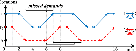 图1:2个无人机协同合作服务3个离散节点位置(s1、s2、s3)
