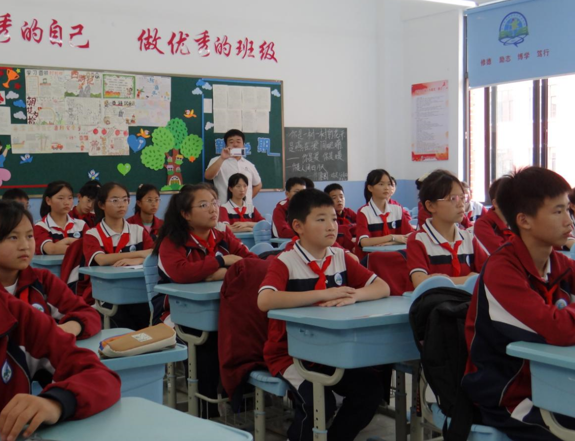 图:安顺市政府办秘书一科刘洋科长与安顺市实验学校经济技术开发区分校校长杨苧来到教室听讲