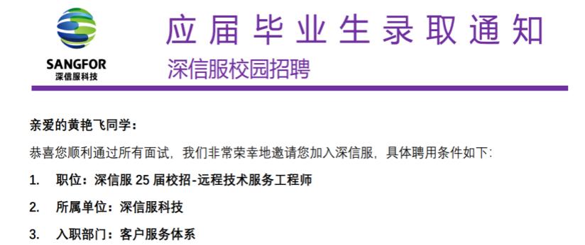 金秋十月,捷报频传。10月19日,黄艳飞同学历经努力,成功斩获深信服offer,这不仅是对其个人能力的高度认可,更是校企联合培养计划结出的又一硕果。