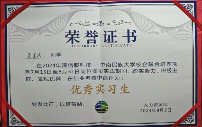 吴金波同学 荣获深信服优秀实习生荣誉证书