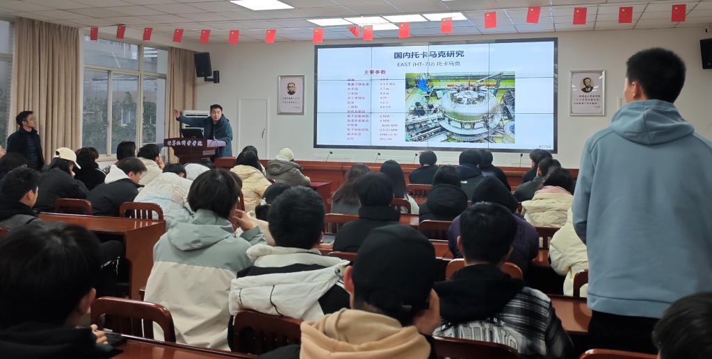科普报告环节,田双双老师以“‘双碳’形势下气体绝缘输配电装备环保替代技术”为题,围绕当前绿色电工装备发展要求,针对气体绝缘设备中大量使用的温室气体SF6替代技术,从研究背景、技术要求、研究方法、研究进展以及国内外发展趋势等方面进行了科普,让同学们了解到了在碳达峰、碳中和的大背景下,电气设备中广泛使用的SF6被环保气体替代的技术方案的最新成果。黄卓老师以“‘人造太阳’中的等离子体原理”为题,回顾磁约束聚变的发展历程,展望核聚变实现商业发电的愿景和面临的挑战。不仅讲述了为获得清洁、可持续的能源,发展可控核聚变的必要性和可行性,而且聚焦于高温等离子体在磁约束聚变中的应用,特别是如何通过强磁场避免等离子体的散逸和提高等离子体的不稳定性。在讲座中,黄老师讲述了自己的研究感悟:“人生积蓄着无穷无尽的能量,就像一滴海水,每一个人都蕴藏着巨大的能量,关键是如何引爆你人生的潜能,释放,燃烧!这就是人生的可控聚变,每个人都可以成为伟大的光源,照亮他人和世界。”给了同学们很大的激励。
